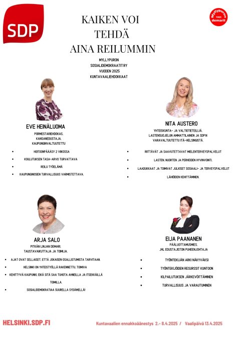 Myllypuron Sosialidemokraatit ry:n kuntavaaliehdokkaat vuodelle 2025 kutsuvat sinut mukaan rakentamaan reilumpaa ja turvallisempaa Helsinkiä! Meidän tavoitteemme on varmistaa kaikille yhdenvertaiset mahdollisuudet ja hyvinvointi, ja haluamme tuoda nämä arvot päätöksentekoon.