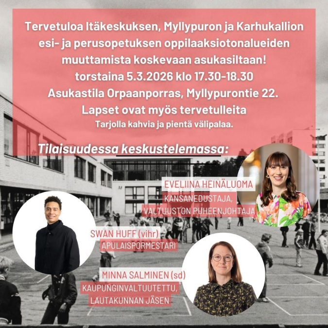 Itäkeskuksen, Myllypuron ja Karhukallion esi- ja perusopetuksen oppilaaksiottoalueisiin suunnitellaan muutoksia. Nyt sinulla on mahdollisuus tulla kuulemaan lisää, esittämään kysymyksiä ja osallistumaan keskusteluun asukasillassa.